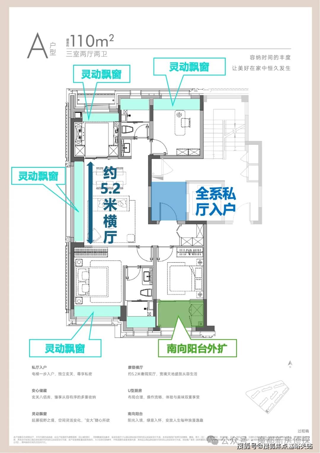 全屋私厅入户,电梯独享,归家仪式感拉满。玄关标配能装下一切的“800库”,收纳力爆炸。约5.2米的大宽厅,连接南向阳台,采光视野无敌。U型厨房、全明户型,每一寸空间都有效利用。