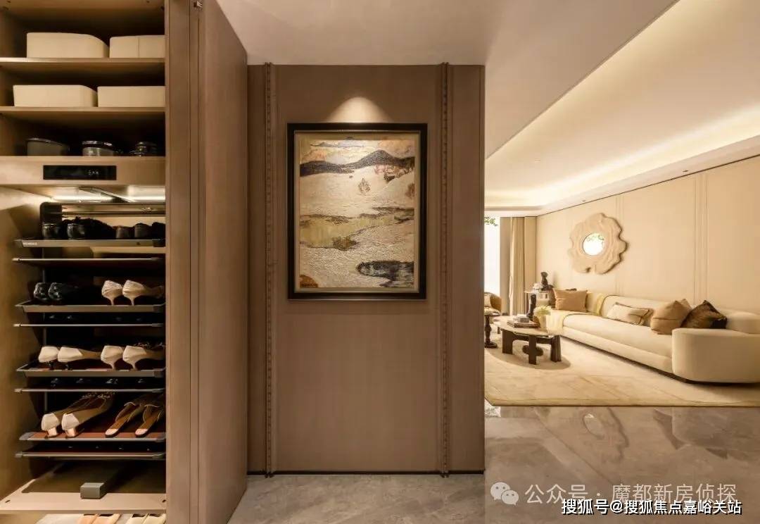 全系私厅入户,电梯直达独立玄关。精心设计的玄关800库系统,从鞋帽到出行物件,均能一一收纳。