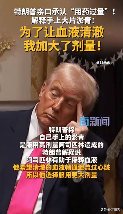特朗普近日在接受采访时透露,自己手背出现大面积瘀青是因为“频繁握手”以及“长期大剂量服用阿司匹林”。